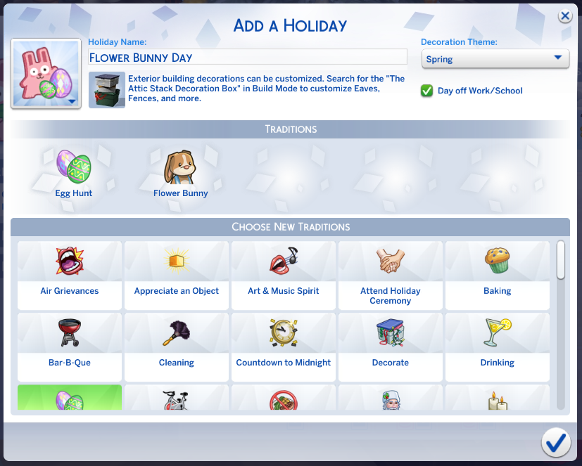 Ở góc trên bên phải, bạn có thể thay đổi loại trang trí sẽ hiển thị trong vùng lân cận. Bạn có thể chọn giữa Ngày tình yêu, Lễ tạ ơn, Đêm giao thừa, Mùa xuân, Ma quái, Lễ hội mùa đông hoặc không. Ngoài ra còn có một hộp kiểm cung cấp cho bạn tùy chọn để cung cấp cho Sim của bạn trong gia đình của bạn một ngày nghỉ làm việc hoặc trường học để ăn mừng kỳ nghỉ này.