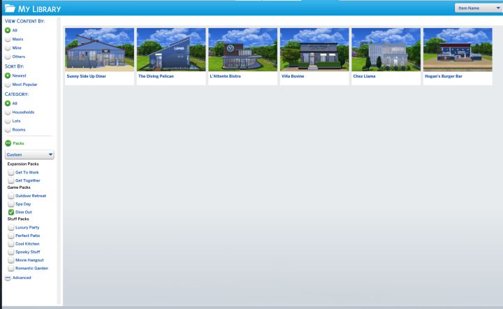 Bây giờ bạn có thể muốn đặt nhiều nhà hàng hơn. Sau khi tất cả, có sáu để lựa chọn! Đi đến ‘My Library’ trong Thư viện nơi EA có các lô được tạo trước, cũng như các sáng tạo của riêng bạn. Nếu bạn lọc theo gói ở dưới cùng bên trái, bạn chỉ có thể thấy các nhà hàng. Ngoài ra, nếu bạn nhập ‘nhà hàng’ ở trên cùng bên phải, bạn có thể nhìn thấy những thông tin này.
